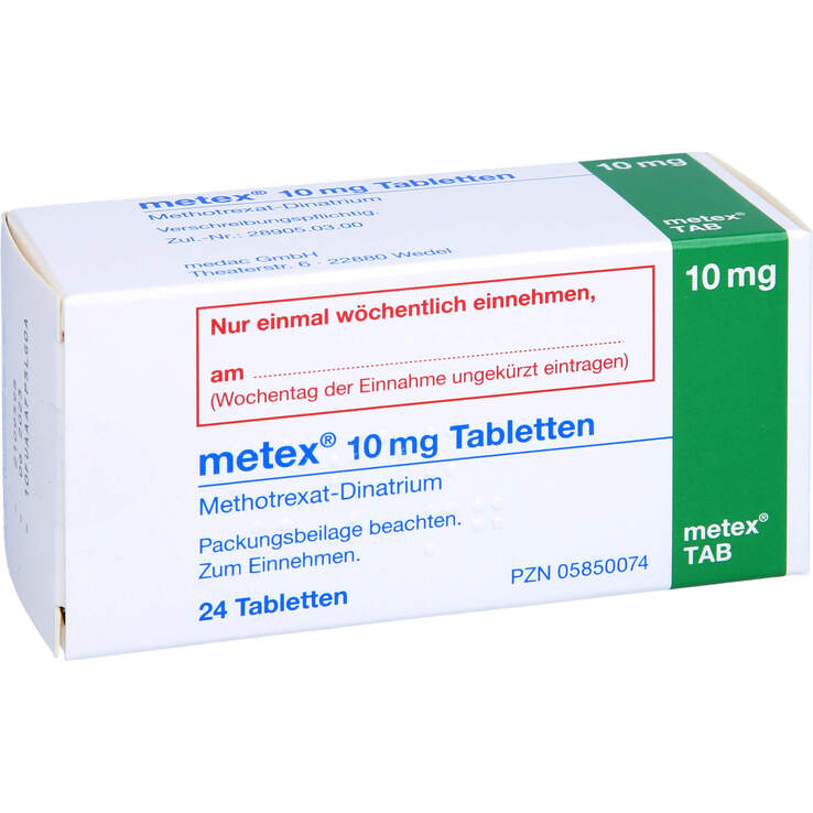 Wirkstoffe & Hilfsstoffe Wirkstoffe Stoffname Bezugsangabe Stoffmenge Methotrexat dinatrium 1 Tablette 10,97 mg entspricht Methotrexat 1 Tablette 10 mg Hilfsstoffe Stoffname Bezugsangabe Stoffmenge Lactose 1 Tablette + Maisstärke, vorverkleistert 1 Tablette + Magnesium stearat 1 Tablette + Gebrauchsinformation Wirkungsweise Wie wirkt der Inhaltsstoff des Arzneimittels? Der Wirkstoff Methotrexat hindert Zellen daran zu wachsen, indem er die Bildung…
